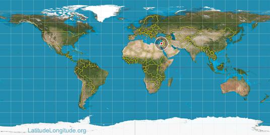 Step for grid lines is 15°. On second map 30° latitude and 30° longitude line is numbered. Map pointer shows the 32.08, 34.78 lat-long coordinates.