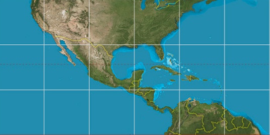 Step for grid lines is 15°. On second map 15° latitude and -90° longitude line is numbered. Map pointer shows the 13.38, -88.35 lat-long coordinates.